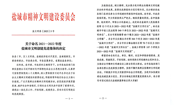 喜報!海興集團榮獲“鹽城市文明單位”稱號